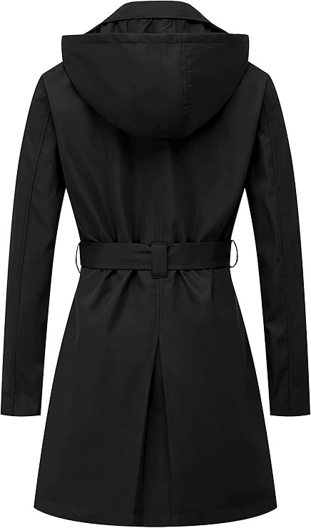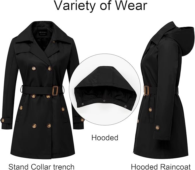 Women’s mid-length double-breasted trench coat made from 3000mm water-repellent, windproof, and UV-resistant polyester. Features a detachable hood, adjustable belt, back vent, 3D tailoring, high-quality buttons, multiple pockets, and durable anti-wrinkle fabric for both business and casual wear.