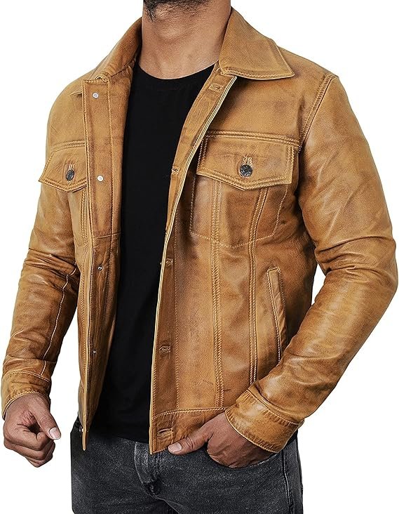 This men’s blue lambskin leather trucker jacket features a smooth surface, button closure, 4 outer and 2 inner pockets, buttoned cuffs, and durable double stitching. Stylish and versatile, it’s perfect for casual, biker, or motorcycle wear, available in 6 colors and various sizes.
