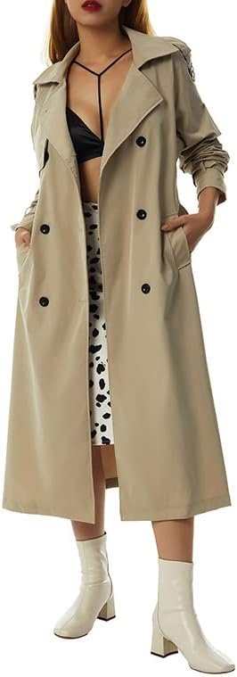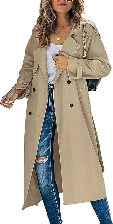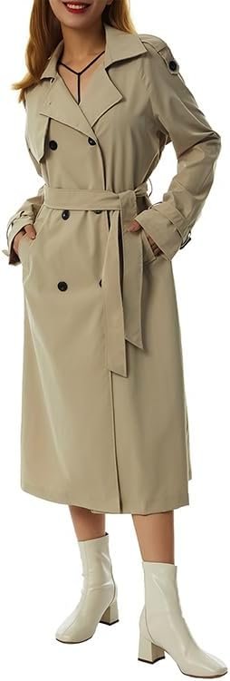 Women’s long double-breasted trench coat made of high-quality polyester, featuring a notched lapel, belt, shoulder epaulets, slits, and full lining for warmth and comfort. Windproof, wrinkle-resistant, and equipped with two deep pockets, it pairs easily with various outfits for business, casual, or formal occasions in autumn and winter.